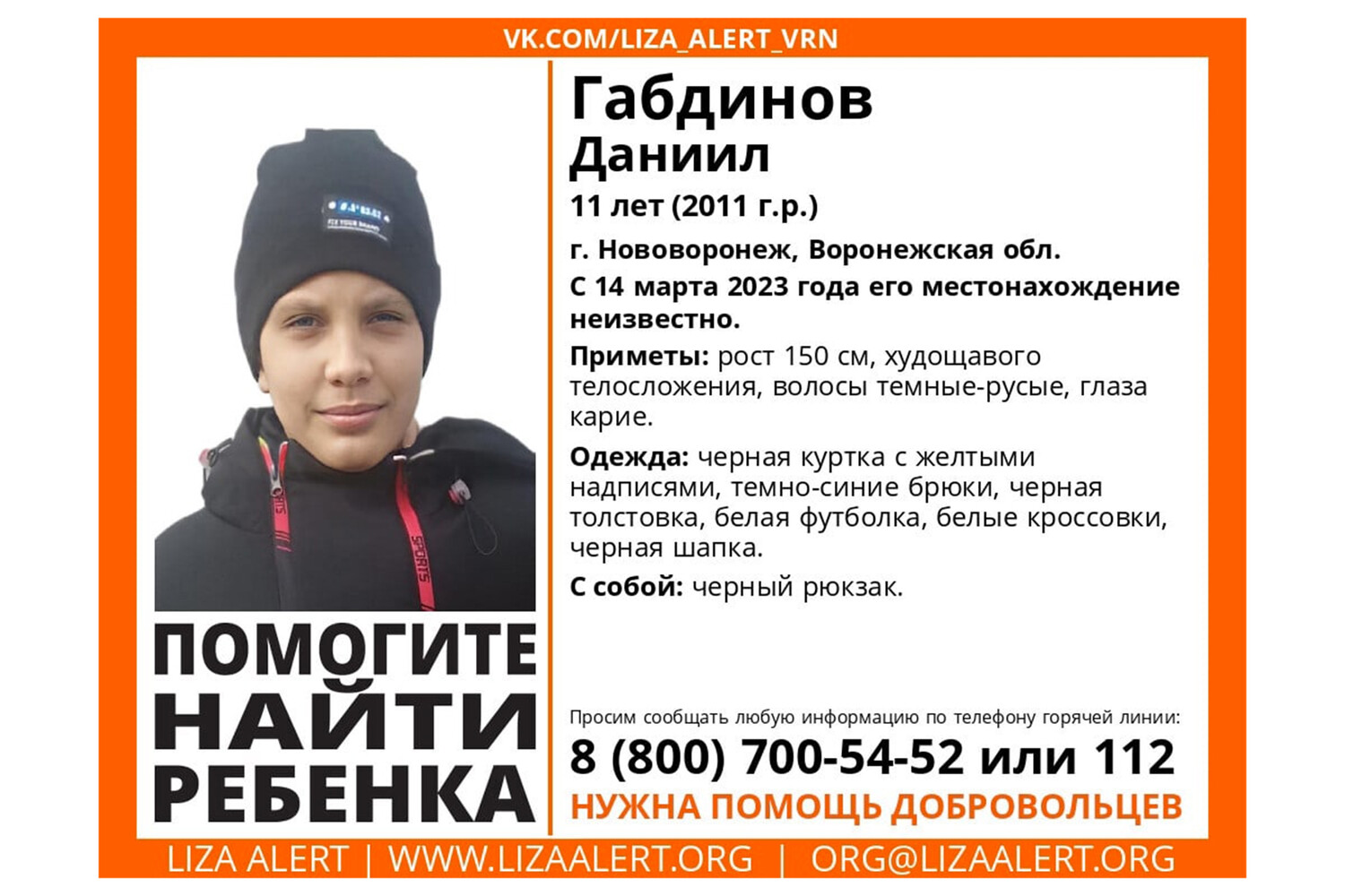 По словам волонтеров, ребенок был одет в черную куртку с желтыми надписями и темно-синие брюки. С собой у мальчика был черный рюкзак.
