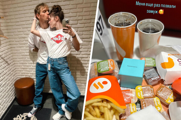 Звезда «Триггера» Ангелина Стречина призналась, что ее позвали замуж в ресторане «Вкусно – и точка». Она похвасталась очередным предложением от своего супруга, показав коробку от ювелирного бренда Tiffany & Co среди заказанных блюд фастфуда.