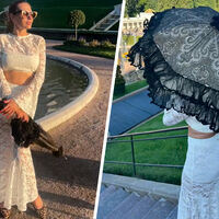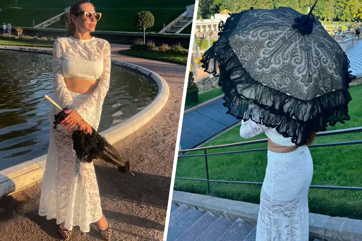 Актриса Эвелина Бледанс прошлась по Петергофу в прозрачном кружевном костюме. Звезда поделилась в соцсетях кадрами, снятыми на территории парка.