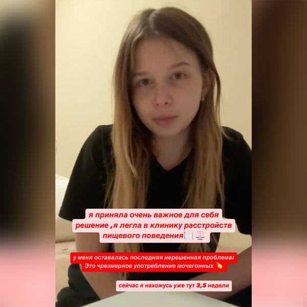 «Я приняла очень важное для себя решение...Легла в клинику расстройств пищевого поведения. У меня оставалась одна нерешенная проблема — я пила чрезмерное количество мочегонных. Это было на протяжении трех лет, постоянно. Так больше не могло продолжаться. Я здесь уже 3,5 недели», — призналась девушка.