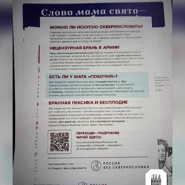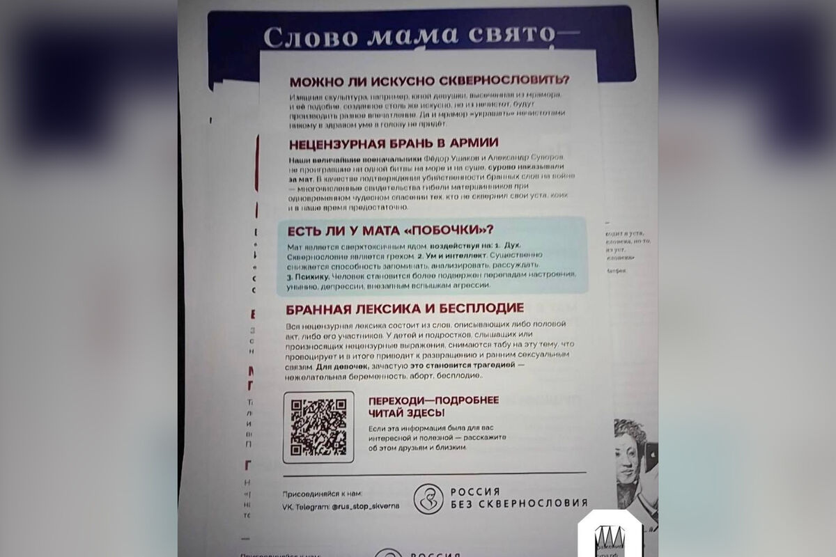 «У детей и подростков, слышащих или произносящих нецензурные выражения, снимаются табу на эту тему, что приводит к развращению и ранним сексуальным связям. Для девочек, зачастую это становится трагедией — нежелательная беременность, аборт, бесплодие», — утверждают создатели буклета (орфография и пунктуация сохранены — «Газета»).