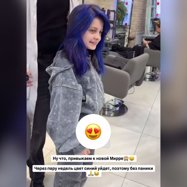 «Привыкаем к новой Мирре. Через пару недель синий цвет уйдет, поэтому без паники. Запрет намного хуже, нежели обсуждение и разумный подход к таким вот изменениям. Мирра начала красить волосы еще зеленкой и сама себя стригла. Но лучше пусть экспериментирует под нашим присмотром и руками профессионалов. Согласитесь? Лучше на раннем этапе все это пройти и потерять интерес, чем жить в запрете, а потом пуститься во все тяжкие. Когда еще экспериментировать, если не в детстве? Мы позволяем то, что не запрещено законом», — высказалась знаменитость.