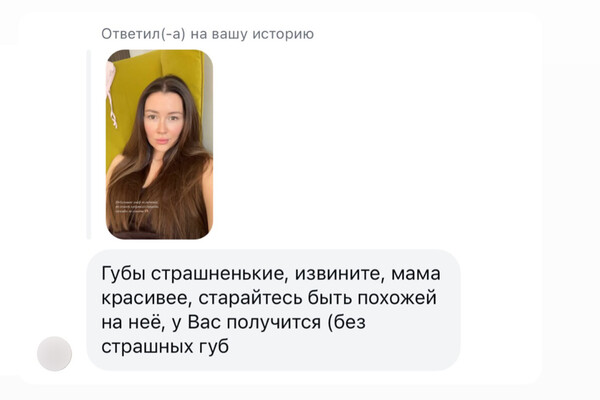 «Периодически получаю подобные негативные комментарии. Заметила, что в 99% это женщины. И так грустно становится от того, что, кто как не женщины должны понимать друг друга и поддерживать, знать, насколько обидно получать такие комментарии насчет своей внешности. На самом деле жаль этих женщин, мне кажется, глубоко в душе они очень несчастны, если занимаются подобным. Наверняка им очень хочется поменять свою жизнь к лучшему, но скорее всего не имеют такой возможности. Девочки, любите себя и делайте то, что делает именно вас счастливыми, и ни на кого не обращайте внимания, вы прекрасны», — высказалась блогер.