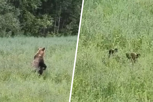 На них медведица с детенышами вышли на открытый участок и поедали свежие злаковые. Периодически самка поднималась на задние лапы — так, по словам инспектора, она показывала, что чувствует присутствие человека и заботилась о безопасности своего потомства.