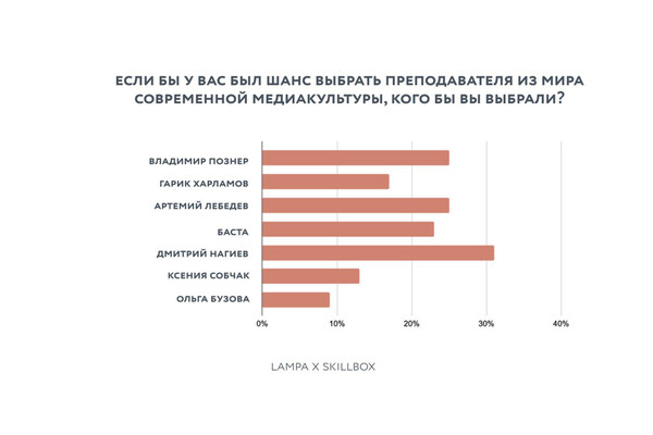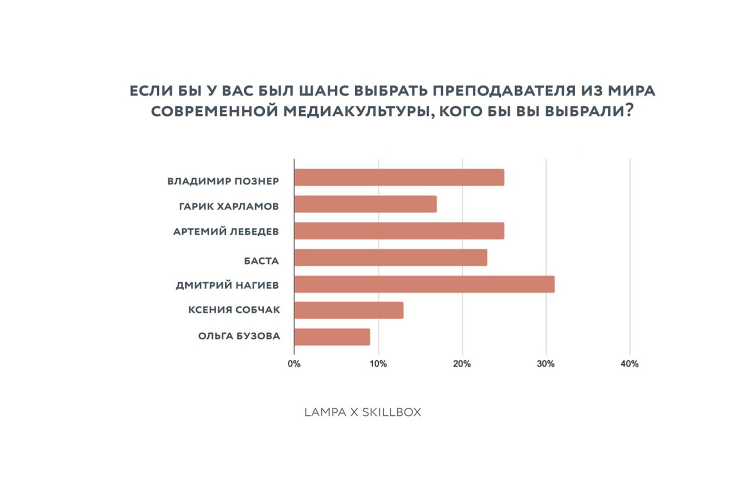 В медиакультуре лидером стал Дмитрий Нагиев (32%), которого ценят за харизму и жизненный опыт. Однако россияне 45–54 лет чаще выбирали Владимира Познера, видя в нем образ мудрого мыслителя.