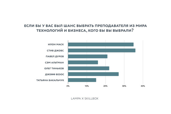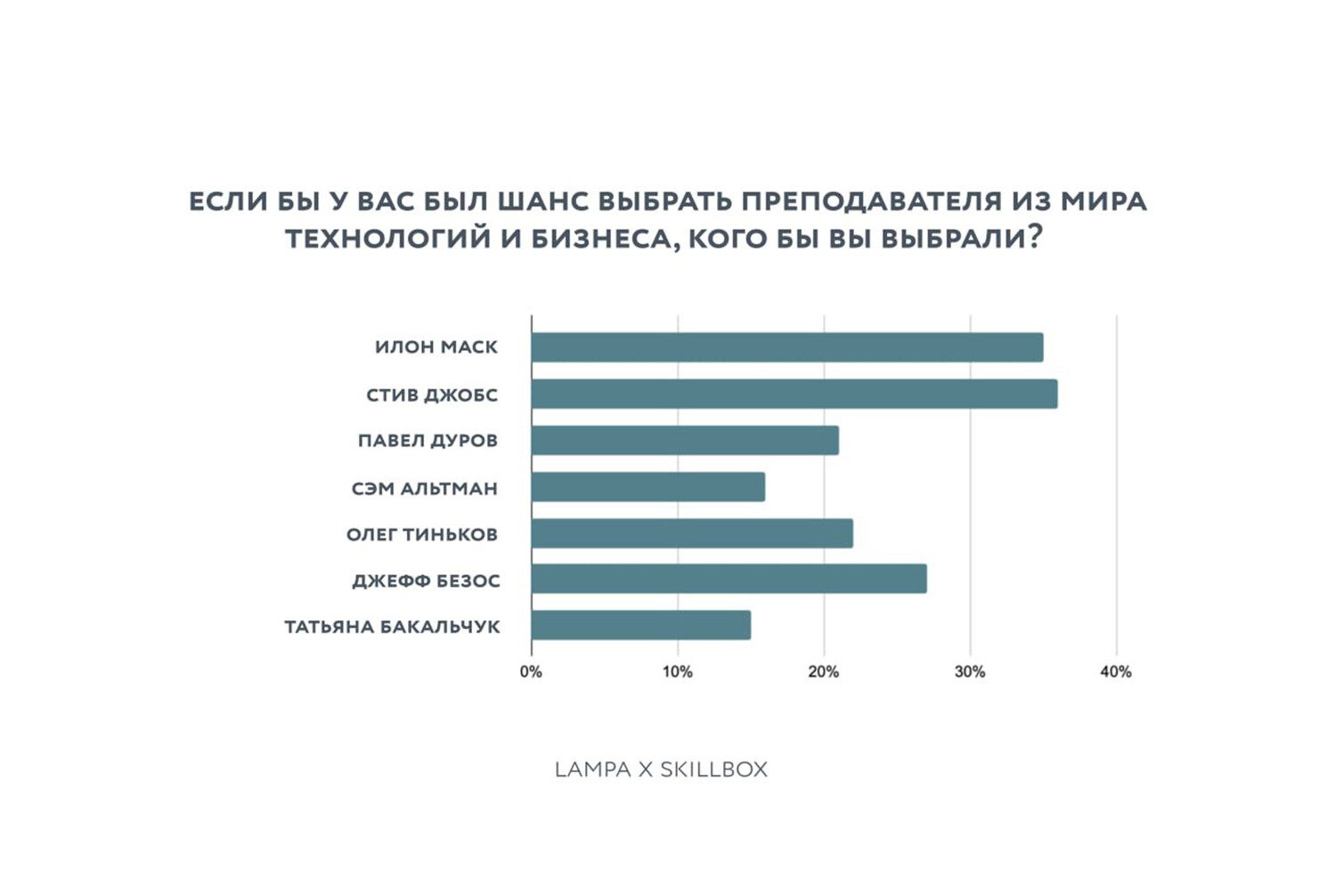 Сфера технологий и бизнеса ожидаемо оказалась за лидерами IT-эпохи: на первом месте Стив Джобс (36%), за ним Илон Маск (35%) и Джефф Безос (27%). Но здесь есть возрастные различия: россияне 25–34 и 45–54 лет чаще выбирали Джобса, тогда как остальные склонялись к Маску.