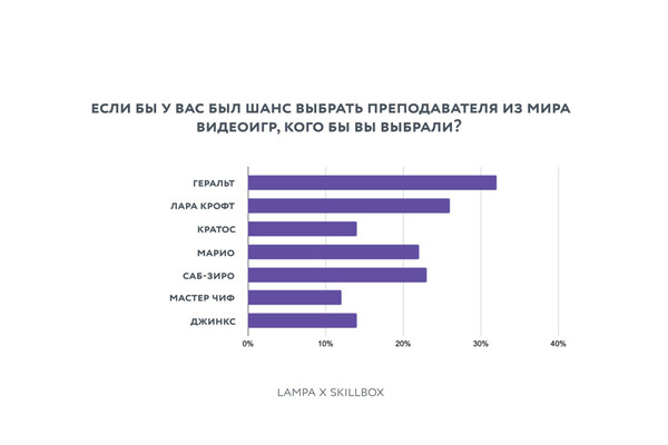 В игровой культуре главным наставником россияне видят Геральта из «Ведьмака» (32%) — героя, сочетающего силу, стратегическое мышление и человеческую уязвимость. Подростки же чаще выбирали Саб-Зиро, а представители старшего поколения (45–54 лет) — Лару Крофт.