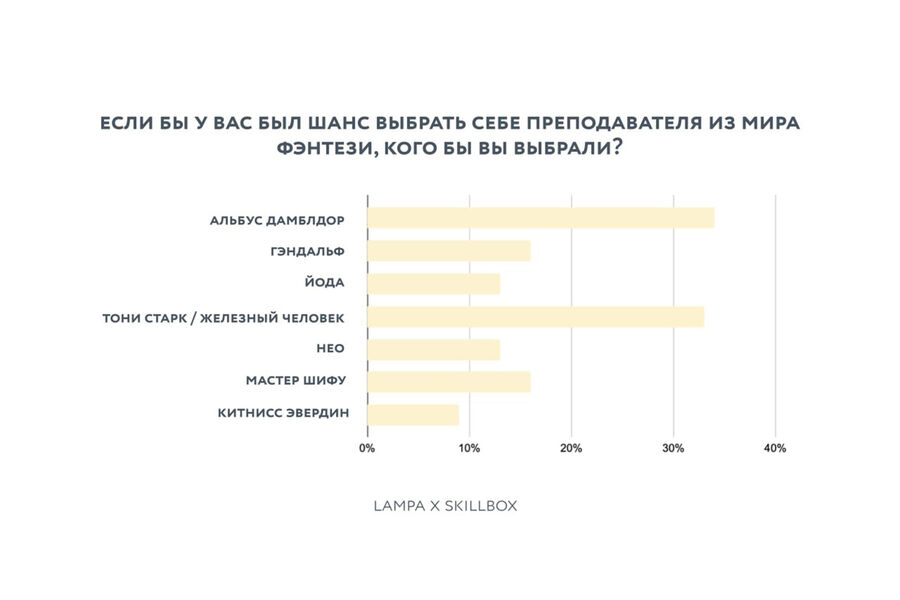 В мире фэнтези россияне чаще всего выбирали Альбуса Дамблдора (34%) и Тони Старка (33%) — два образа, которые символизируют мудрость и технологичность.
