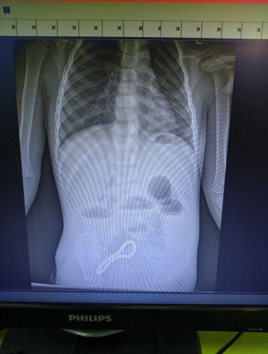 Ребенок попал в больницу с жалобами на проблемы с пищеварением. Медики предположили наличие в ЖКТ инородного тела, что подтвердил рентген.