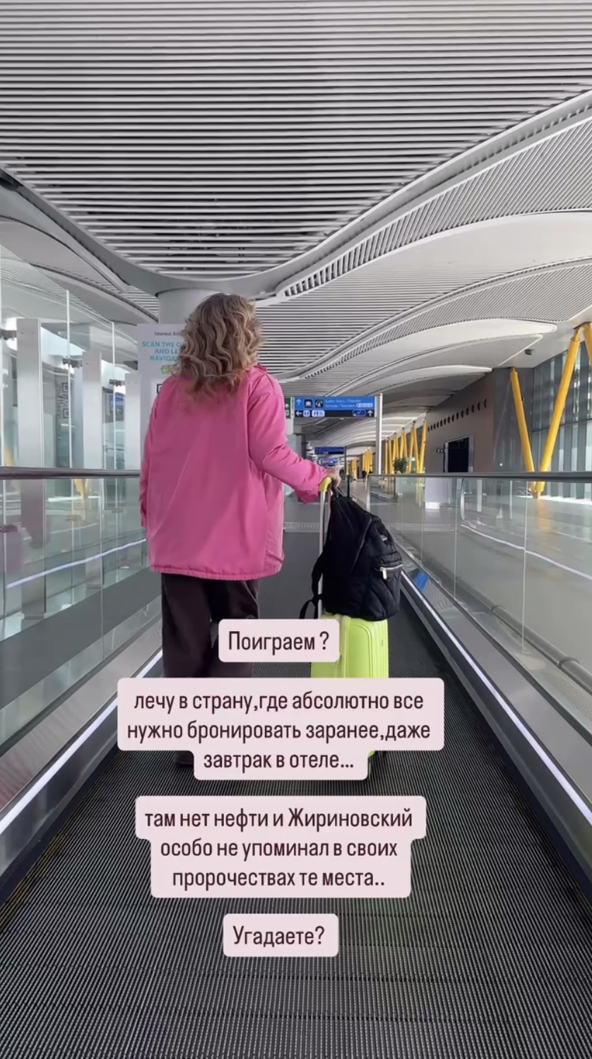 «Поиграем? Лечу в страну, где абсолютно все нужно бронировать заранее, даже завтрак в отеле...Там нет нефти, и Жириновский особо не упоминал в своих пророчествах те места... Угадаете?» — дала подсказки артистка.