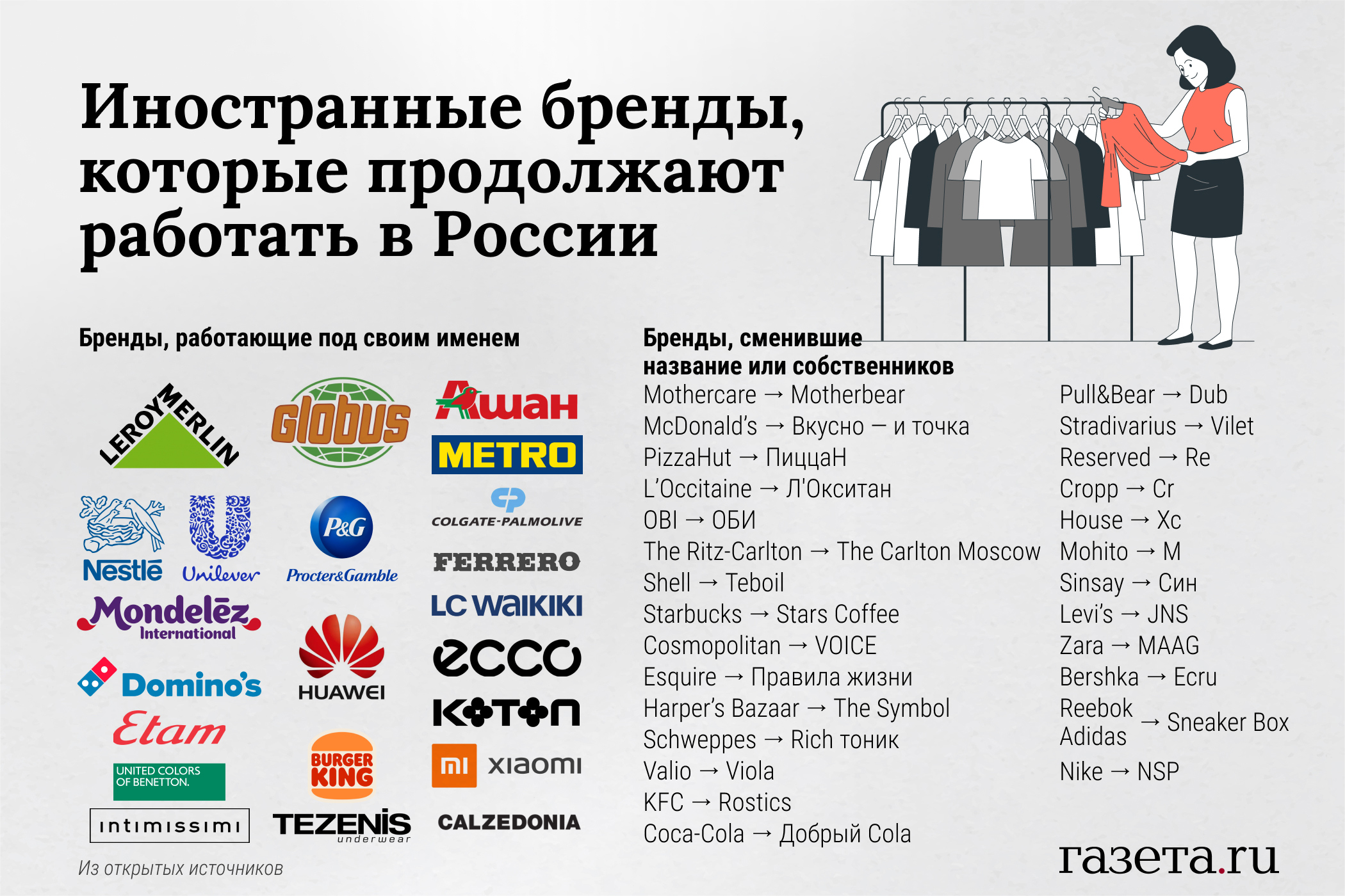 Кто из крупных международных организаций остался в России на июнь 2023 года, если не считать бренды из Китая, Белоруссии и Казахстана, — в инфографике «Газеты.Ru».