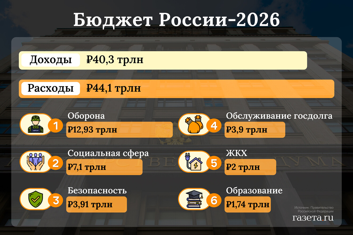 Госдума утвердила в третьем, окончательном, чтении федеральный бюджет России на 2026 год. Теперь документ должен одобрить Совфед, после чего его направят на подпись президенту Владимиру Путину. Доходы бюджета, согласно прогнозам Минфина, составят 40,3 трлн рублей, а расходы превысят 44 трлн рублей. Основными расходными статьями традиционно остаются сферы обороны, безопасности и социальной политики. Подробности — в инфографике «Газеты.Ru».