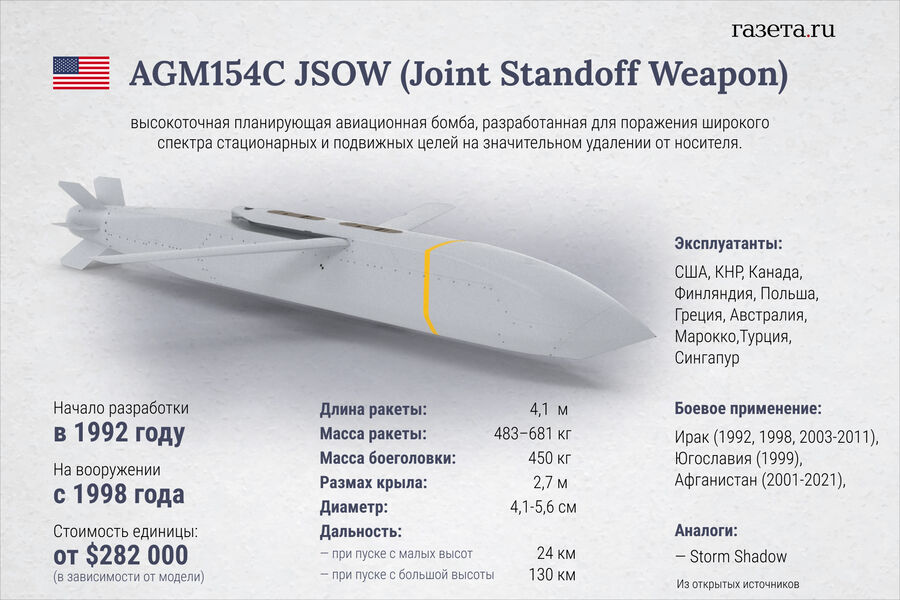 На Украине допустили, что с помощью JSOW Пентагон хочет одновременно выполнить просьбы ВСУ, но формально не перейти «красные линии» России. Дело в том, что их можно превратить в крылатые ракеты большой дальности. Достаточно на месте сделать малогабаритный двигатель и встроить его в бомбу.