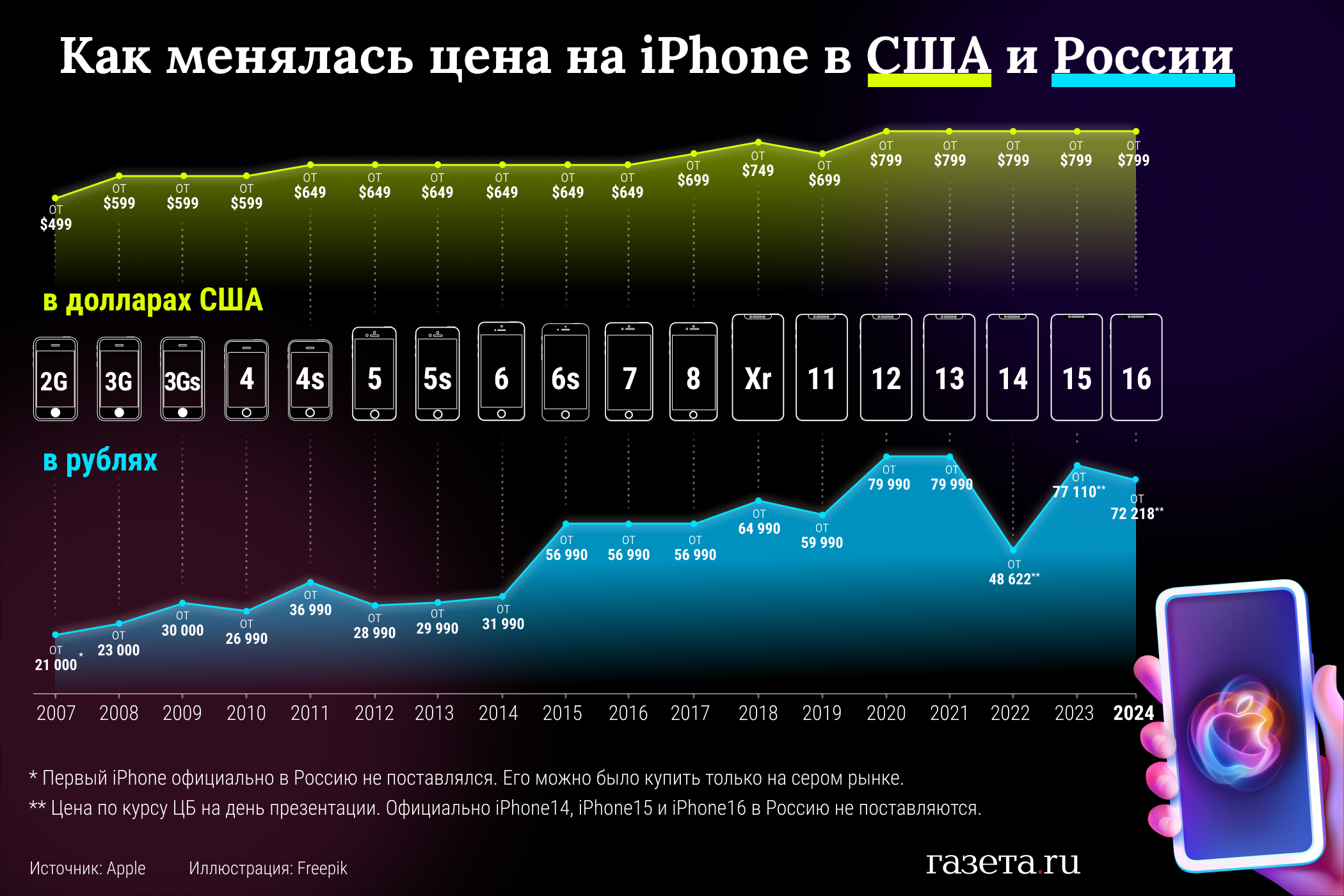 Как менялась цена на iPhone в России и США с 2007 года — в инфографике «Газеты.Ru».