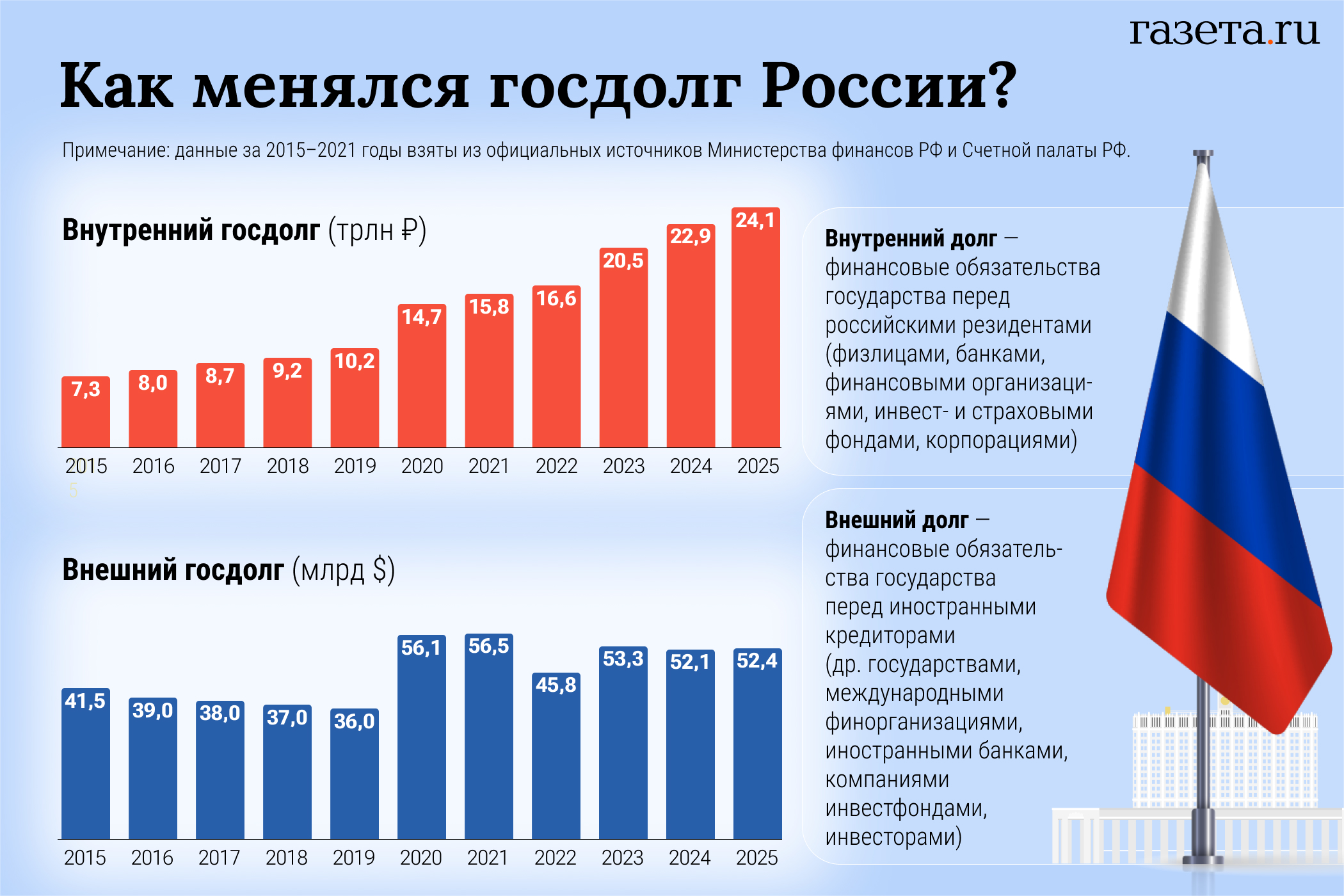 Согласно проекту федерального бюджета, на 1 января 2026 года внутренний госдолг России должен быть не более 29,39 трлн рублей, а внешний — $61,1 млрд.