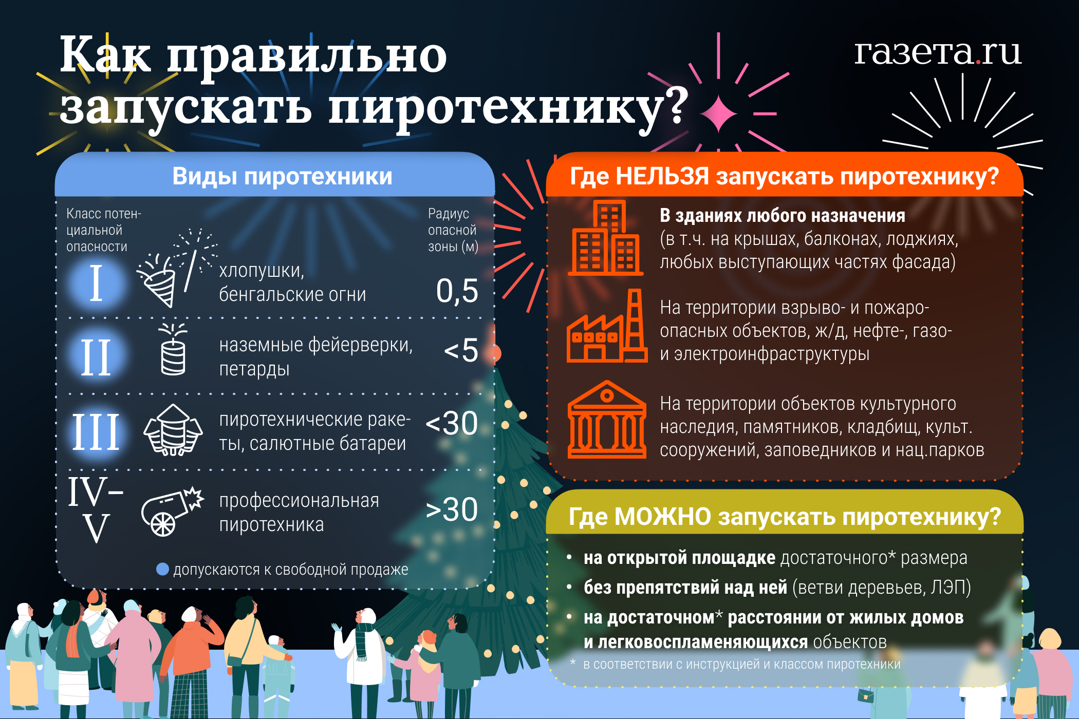 Жилые дома и здания должны находиться на достаточном расстоянии от места запуска пиротехники. Безопасное расстояние определяется согласно инструкции к пиротехническому средству. Также необходимо учитывать скорость ветра, при ветренной погоде лучше воздержаться от запуска. В жилых кварталах соблюсти эти требования практически невозможно. Во многих городах существуют специальные площадки для запуска пиротехники. Узнать их расположение можно на сайтах органов местного самоуправления.