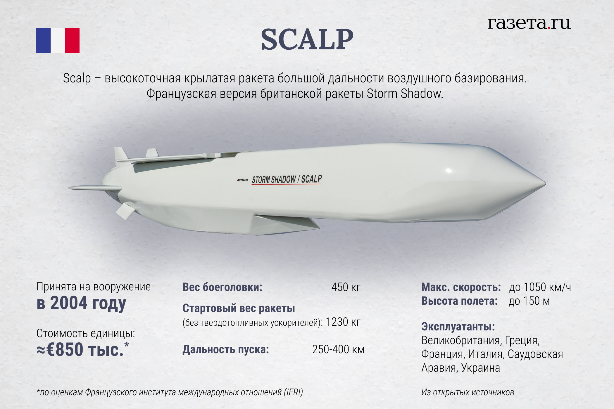 Scalp — высокоточная крылатая ракета большой дальности воздушного базирования. Ракета разработана в 1990-х компаниями Matra и British Aerospace. Ракета Scalp идентична британским снарядам Storm Shadow. Подробнее о ракете SCALP — в инфографике «Газеты.Ru».
