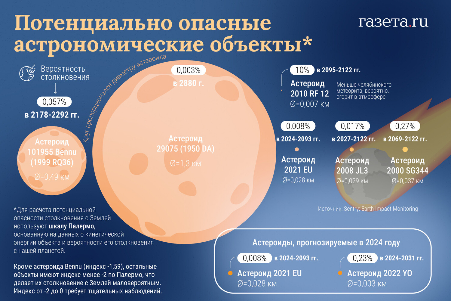 3 октября Земля сближается с астероидом 349507 (2008 QY). Он считается потенциально опасным, поскольку его диаметр примерно равен километру и он периодически пролетает мимо нашей планеты на дистанции меньше 20 расстояний от Земли до Луны. NASA отслеживает подобные опасные тела и оценивает вероятность их падения. О самых опасных из них — инфографика «Газеты.Ru».