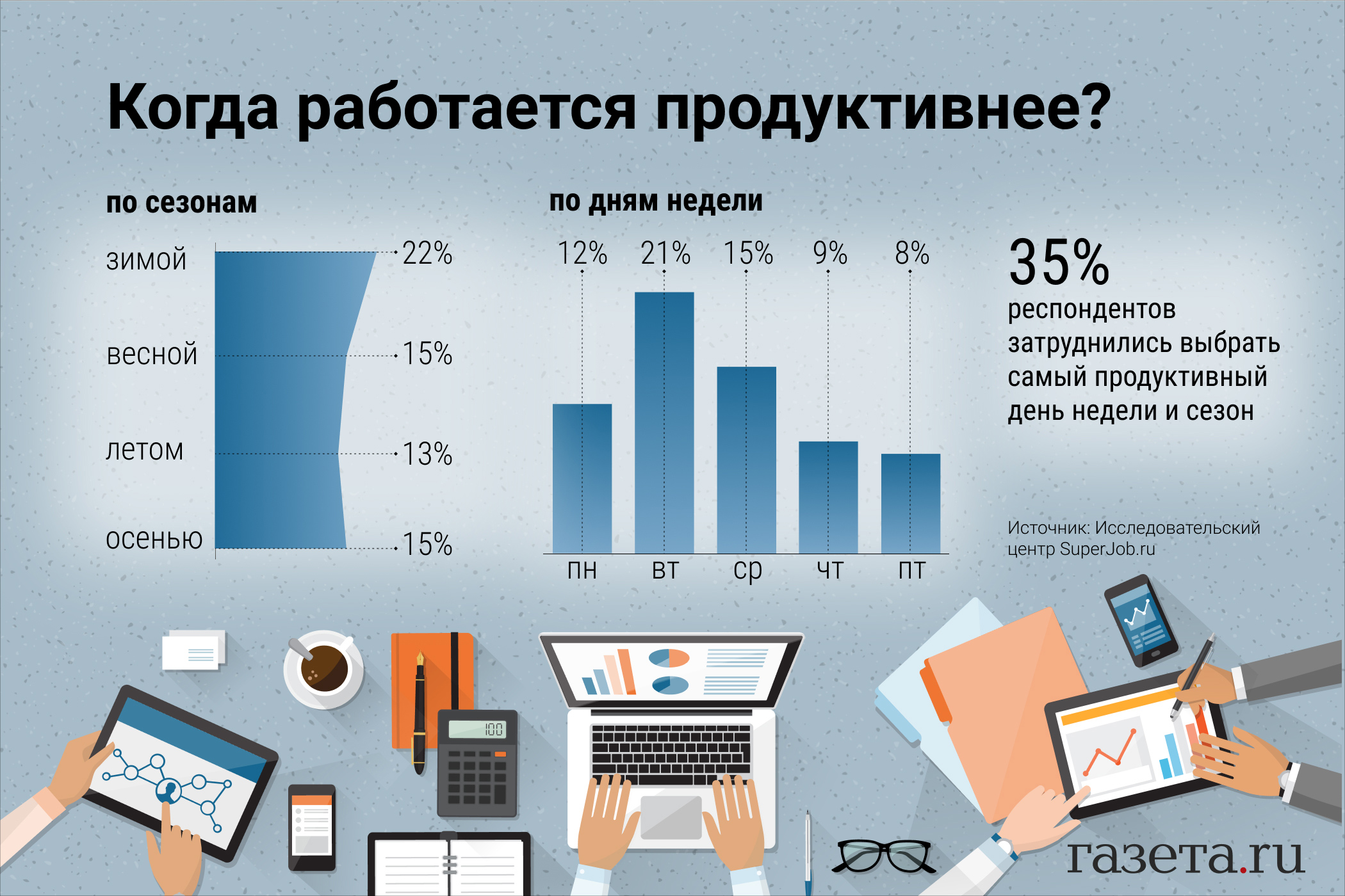 Россияне рассказали, какое время года и какой день недели считают самыми продуктивными. Исследование проводил сервис по поиску работы SuperJob.