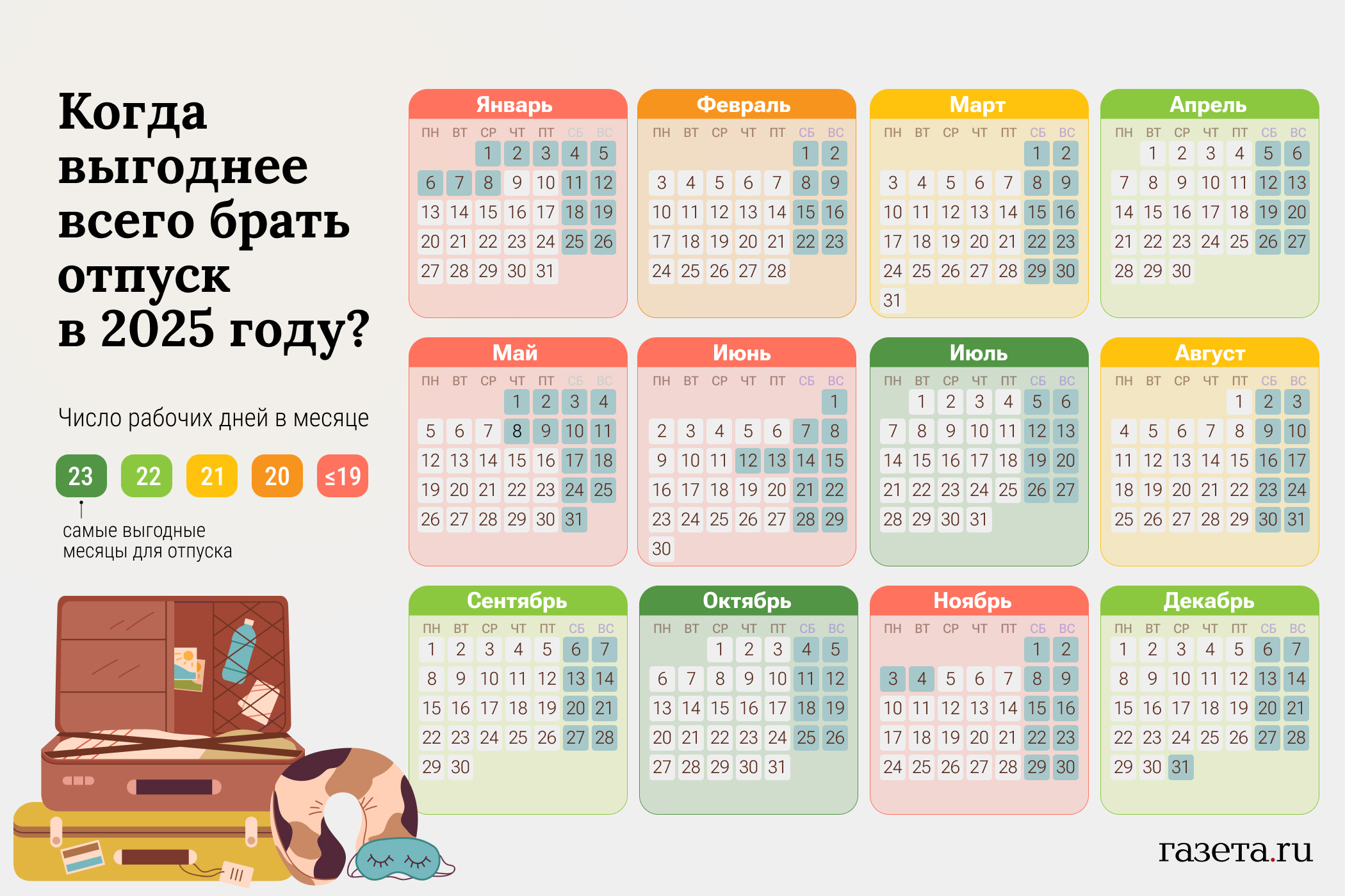 Самыми выгодными месяцами для отпуска будут те, в которых максимальное число рабочих дней, в 2025 году это июль и октябрь (в них по 23 рабочих дня). Хорошо подойдут апрель, сентябрь и декабрь (22 рабочих дня). Меньше всего рабочих дней в январе, мае, июне и ноябре, поэтому они с точки зрения выгоды будут наименее подходящими.
