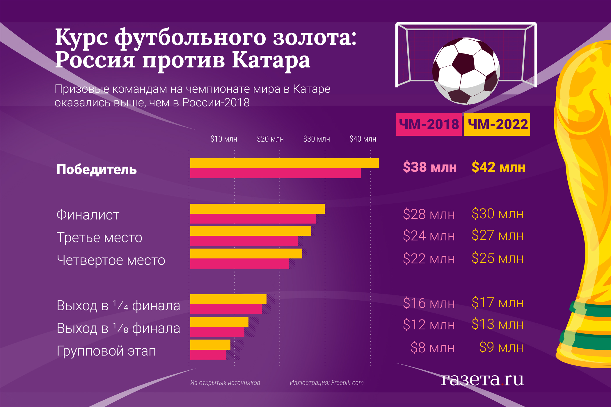 Сколько зарабатывали команды на российском мундиале и сколько заработают в Катаре — в инфографике «Газеты.Ru».