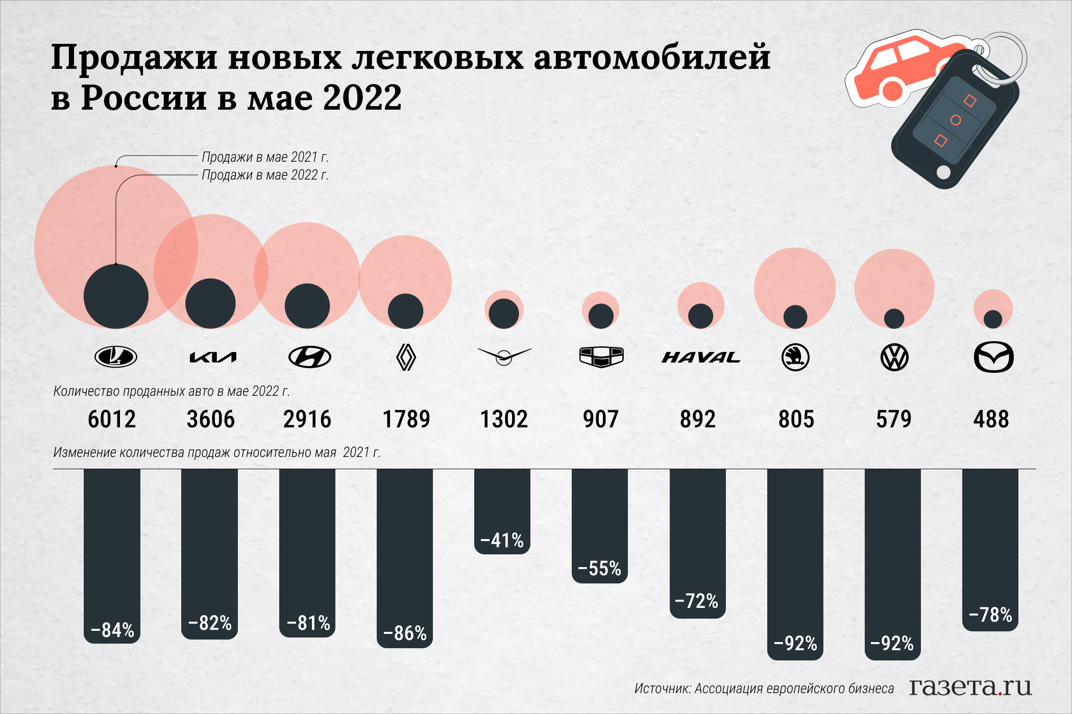 На сколько упали продажи новых автомобилей в мае 2022 года — в инфографике «Газеты.Ru»