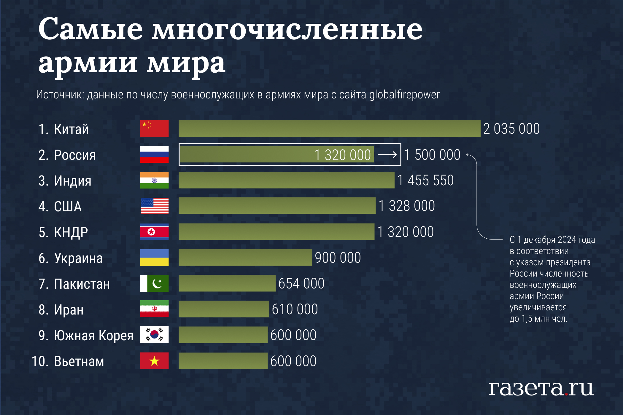 С 1 декабря численность военных в рядах армии России увеличится до 1,5 млн человек. Если до этого времени какая-либо другая страна не решит существенно нарастить ряды своих вооруженных сил, Россия займет второе место в мире по числу военных.