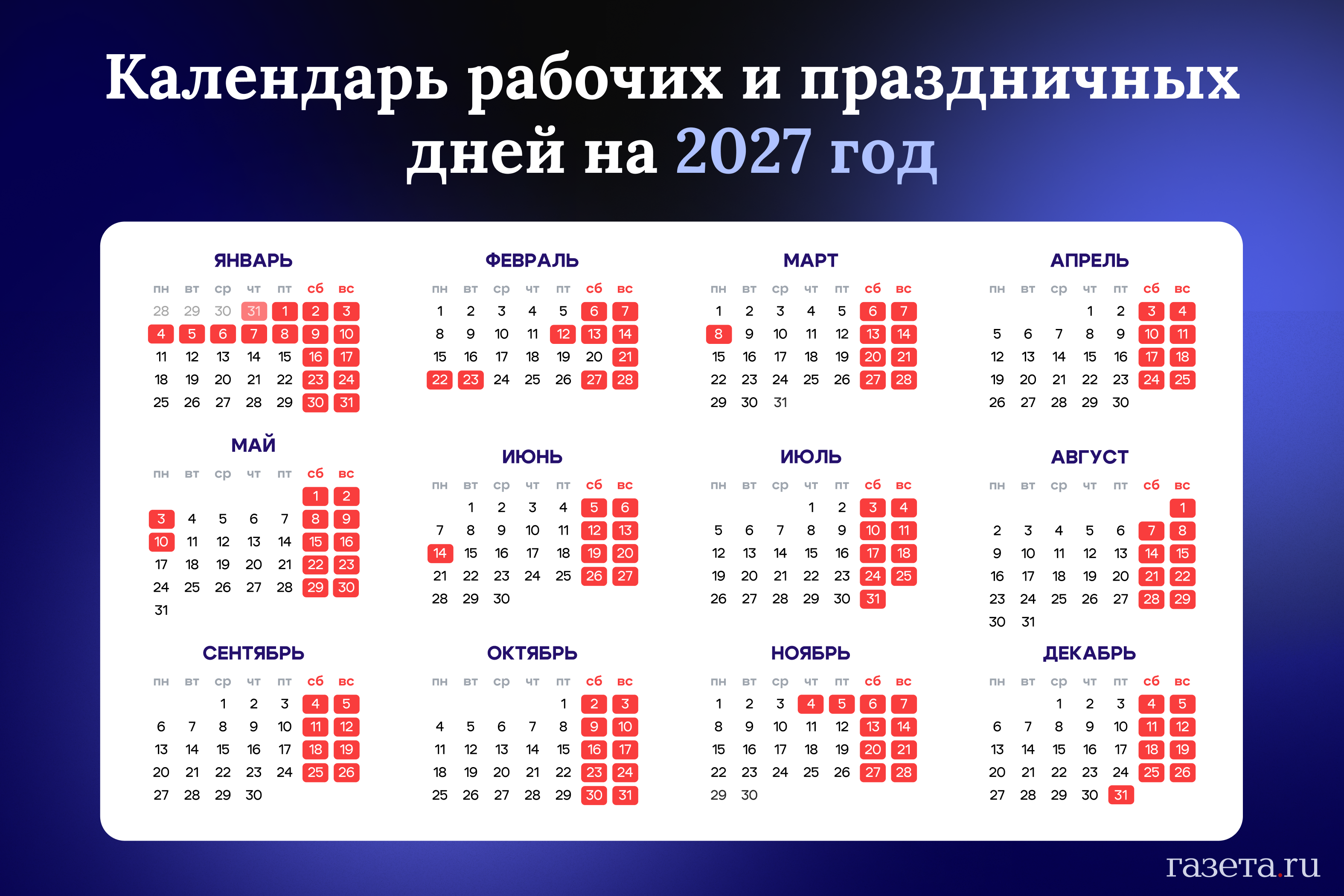 Минтруд РФ опубликовал проект производственного календаря на 2027 год. Новогодние праздники в этот раз продлятся 11 дней — с 31 декабря по 10 января. Выходные по три дня ждут россиян в феврале и марте, дважды в мае, а также в июне. Кроме того, по случаю Дня народного единства запланированы четыре выходных в ноябре. Как мы будем работать и отдыхать в 2027-м — в инфографике «Газеты.Ru».