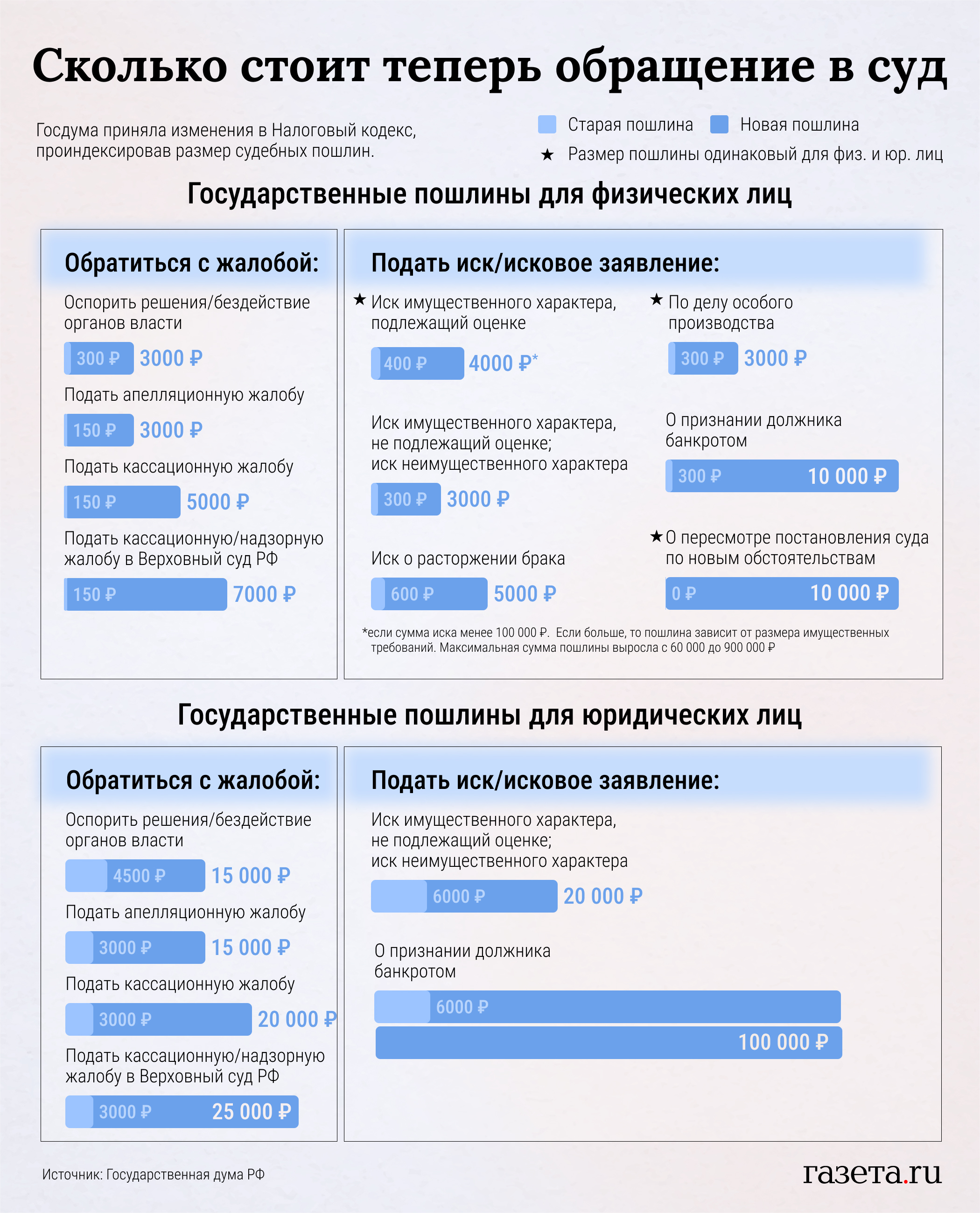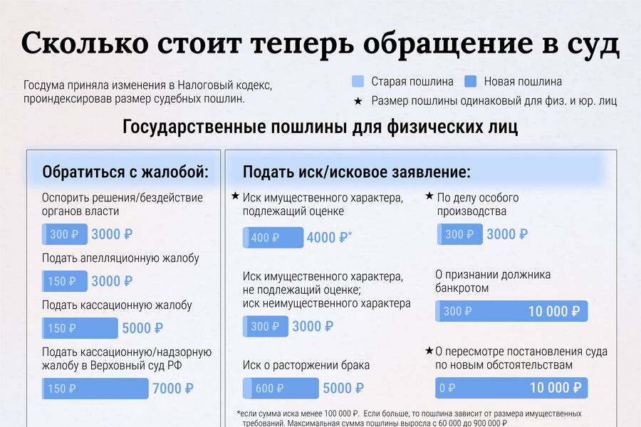 Госдума приняла изменения в Налоговый кодекс, проиндексировав размер судебных пошлин. Стоимость подачи заявлений в суд вырастет и для граждан, и для организаций. Так, дороже станет разводиться, спорить с органами власти и жаловаться в Верховный суд.