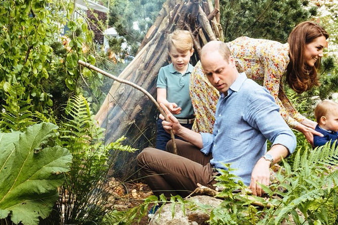 На фотографии изображены играющие в саду принц, его супруга и их дети: принц Луи, Джордж и Шарлотта.