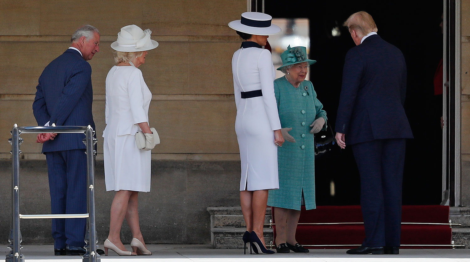 Принц Чарльз сопровождал Трампа на западную террасу дворца, президент радостно поприветствовал улыбающуюся королеву.