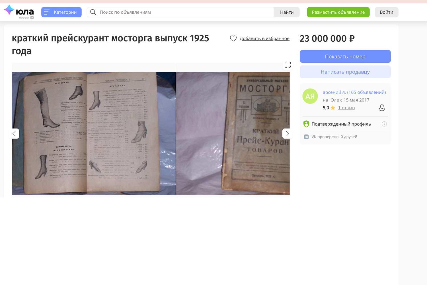 Пользователь соцсетей выставил на платформах «Объявления Вконтакте» и «Юла» антикварный прейскурант ЦУМа за 1925 год. Цена, которую просит продавец за этот артефакт, составляет 23 млн рублей.