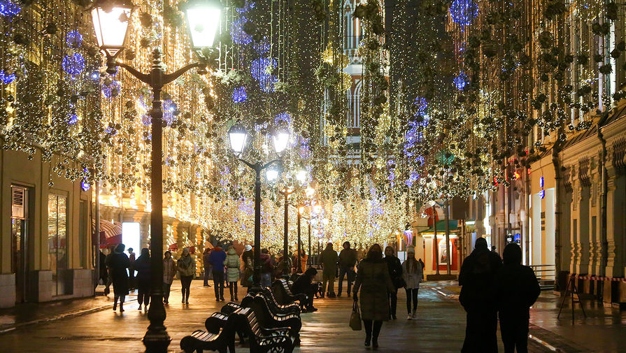 Москвичи, которые могут себе позволить поездку в центр города, продолжают делать селфи на украшенных Никольской улице и Камергерском переулке, рядом с оленями и раковинами с жемчужинами из гирлянд, приспуская маску.