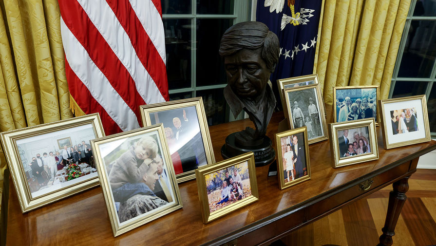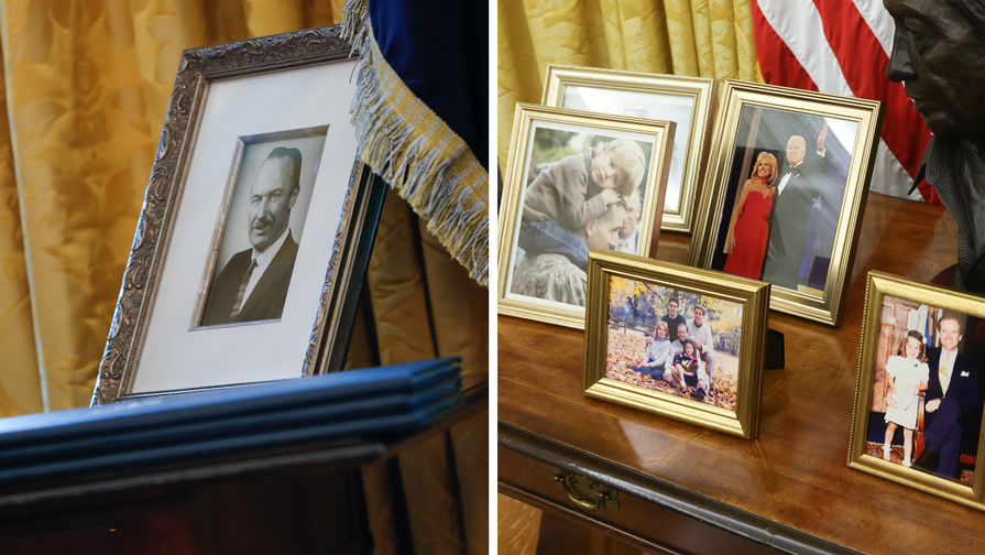 Развешанные на стенах портреты американских президентов Байден поменял местами, а пейзажи из фондов Белого дома – заменил. Фоторамки с детьми и родителями Трампа, естественно, убрал, а на их место поставил свои, причем фотографий в кабинете стало раза в три больше.