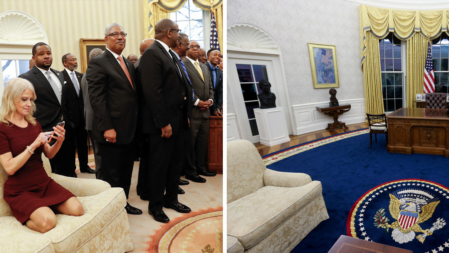 Диваны с парчовой обивкой кремового цвета, которые появились в Овальном кабинете при Трампе, Байден убирать не стал, либо пока не успел. Они запомнились американцам этическим скандалом, когда советник Трампа Кэллиэнн Конуэй разулась и забралась на диван с ногами во время визита в Белый дом афроамериканской студенческой общины. Она сделала это, чтобы сфотографировать гостей с более удачного ракурса, но многие посчитали, что повела она себя неэтично, усевшись на диван перед гостями.