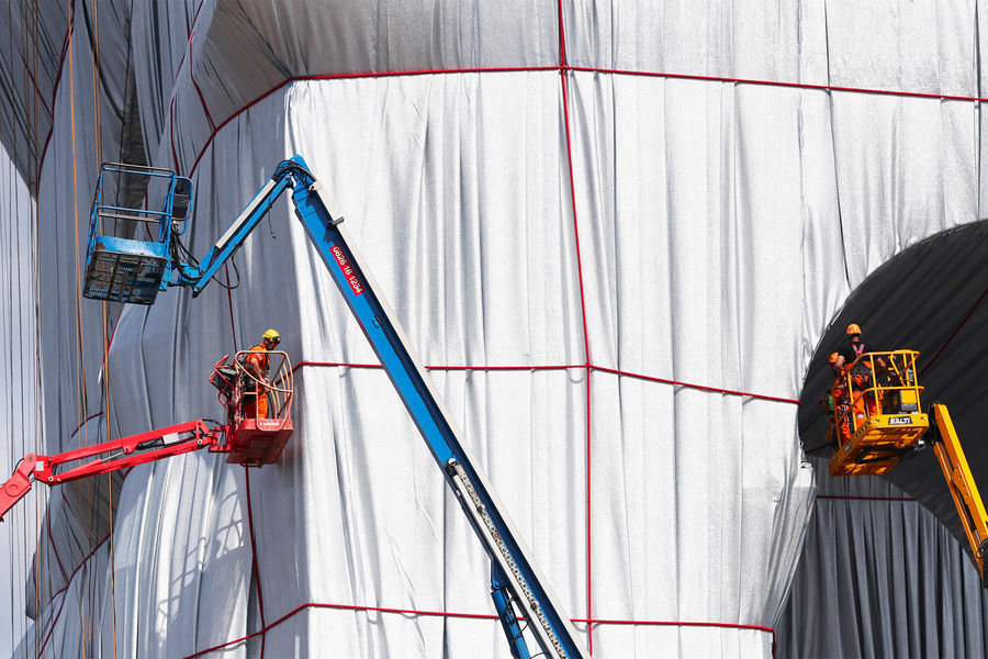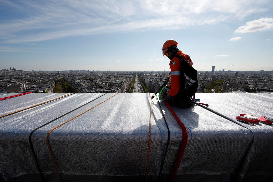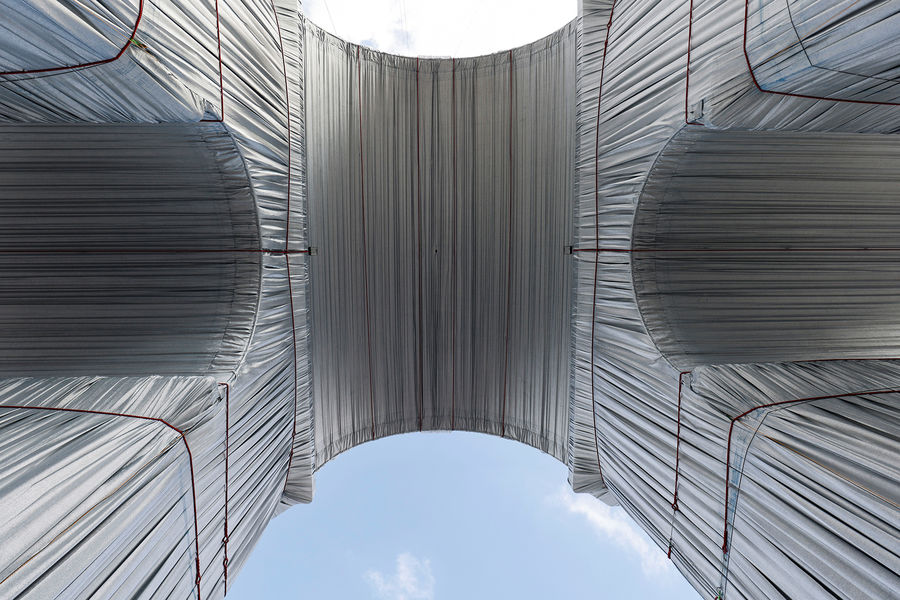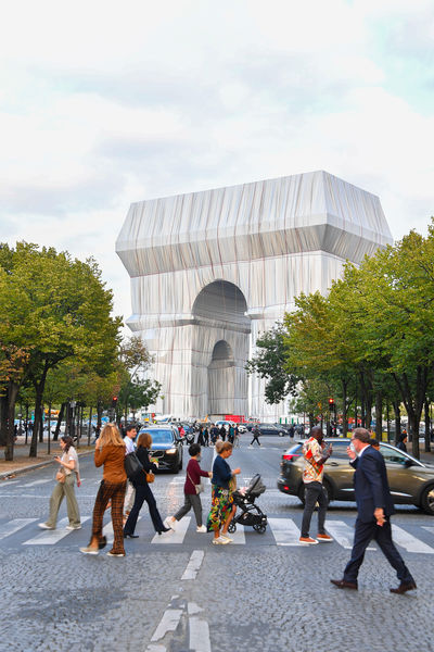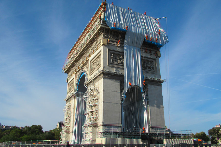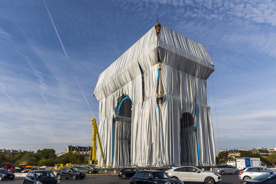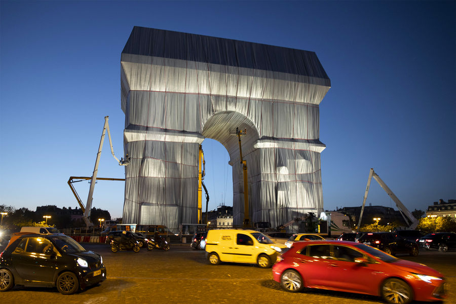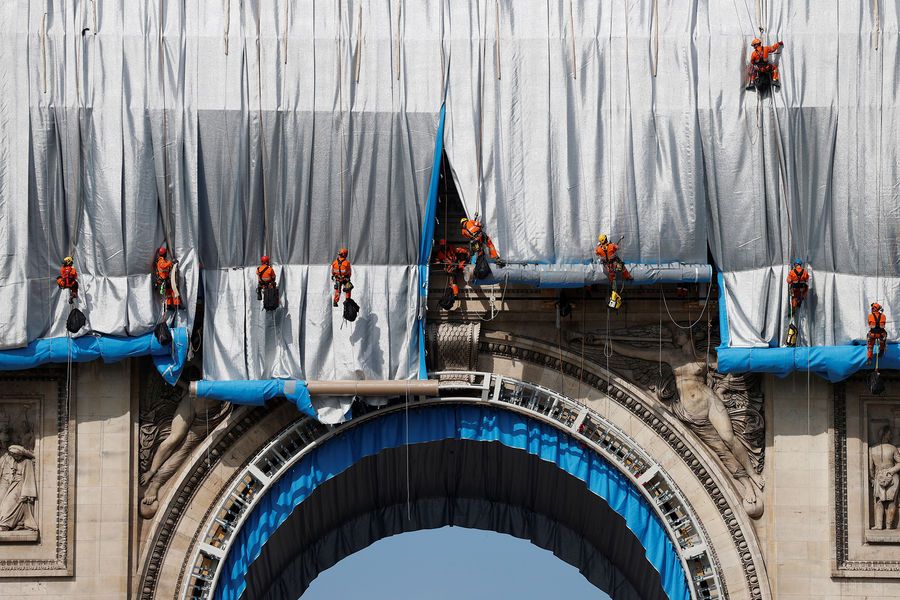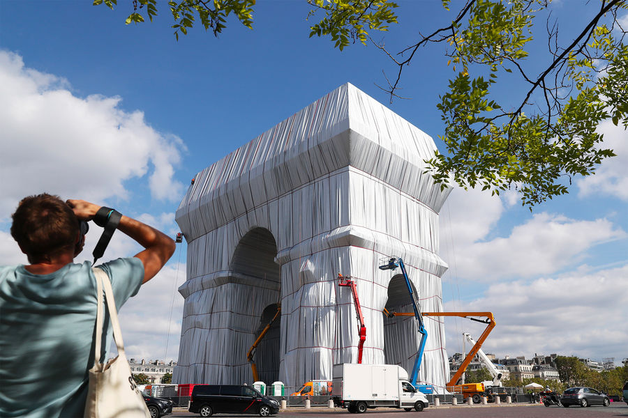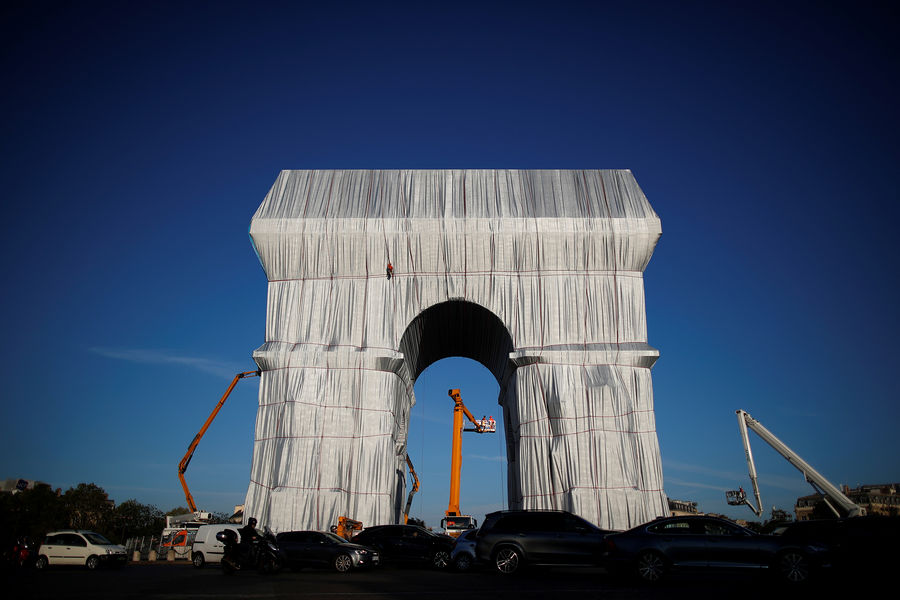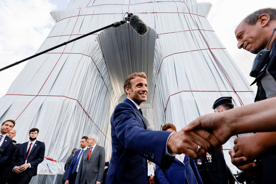 Президент Франции Эммануэль Макрон и его супруга Бриджит открыли в Париже масштабное произведение современного искусства — Триумфальную арку на площади Шарля де Голля, укутанную в полипропиленовую пленку. На церемонии открытия также присутствовали министр культуры Франции Рослин Башело и мэр Парижа Анн Идальго. Автором этой инсталляции был художник болгарского происхождения Христо Явашев, или просто Христо, скончавшийся 31 мая 2020 года во возрасте 84 лет.