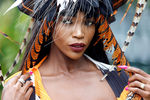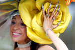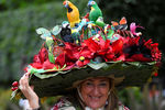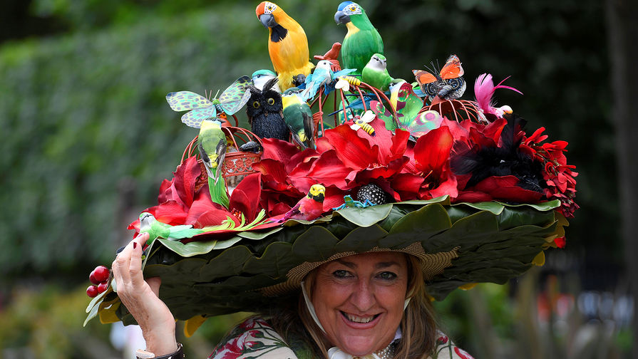 дама в шляпке, напоминающей целый райский сад с яркими цветами, множеством искусственных бабочек, попугаев, сов и миниатюрных ягод,