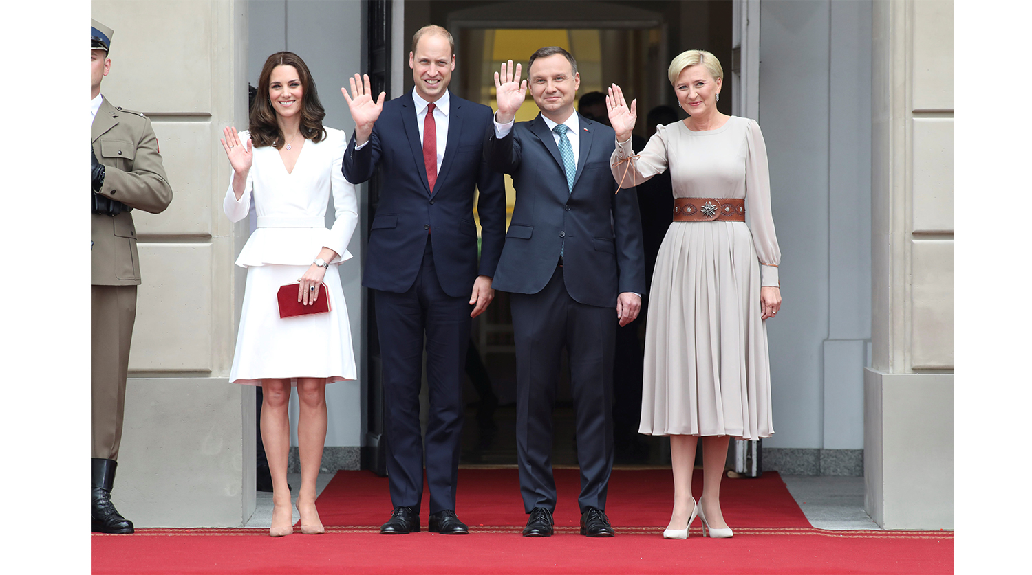 Первой точкой европейского турне стала Варшава. С трапа самолета Кейт Миддлтон спустилась в белоснежном костюме Alexander McQueen. Образ состоял из приталенного пиджака с баской и расклешенной юбки чуть выше колен. Стройные ноги подчеркивали бежевые лодочки, визуально удлиняющие икры. Кстати, к выбору нарядов для детей Миддлтон также подошла со всей ответственностью: принцесса Шарлотта была одета в красное платье с мелкими белыми цветами, а принц Джордж был в красно-белой клетчатой рубашке и тканевых шортах с широким ремнем.
