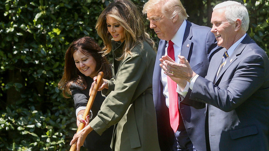 Jonathan Ernst/ReutersВо время посадки клена на лужайке у Белого дома поначалу на самом деле все шло хорошо — если не считать того, что действительно никто из присутствовавших на мероприятии не надевал масок и перчаток. Президент США Дональд Трамп сначала выступил с небольшой речью перед группой собравшихся — перед трибуной на расставленных на приличном расстоянии друг от друга стульях разместились лидер республиканского большинства Палаты представителей Кевин Маккарти, министр внутренних дел Дэвид Бернхарт, министр сельского хозяйства Сонни Пердью, глава Агентства по охране окружающей среды Эндрю Уиллер, а также вице-президент Майкл Пенс и его супруга Карен. Меланья Трамп, одетая в оливкового цвета плащ Victoria Beckham и лодочки Manolo Blahnik, заняла место рядом с супругом.