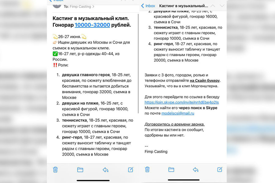 В приглашении которое получила модель, говорилось об отборе девушек 16-17 лет размера 40-44, проживающих в Москве и Сочи. Чтобы принять участие в кастинге, необходимо было отправить заявку с тремя фотографиями в Skype, после чего переходить по ссылке в беседу. «Указывайте, что вы в клип Моргенштерна», — уточнялось в тексте письма.