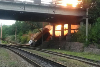 В Саратове грузовик вызвал крупный пожар, рухнув с моста на газовую трубу