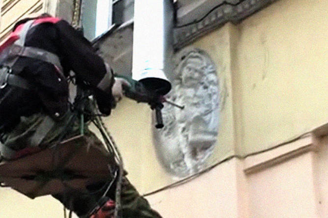 Рабочие просверлили барельеф ангела на историческом здании в Петербурге