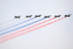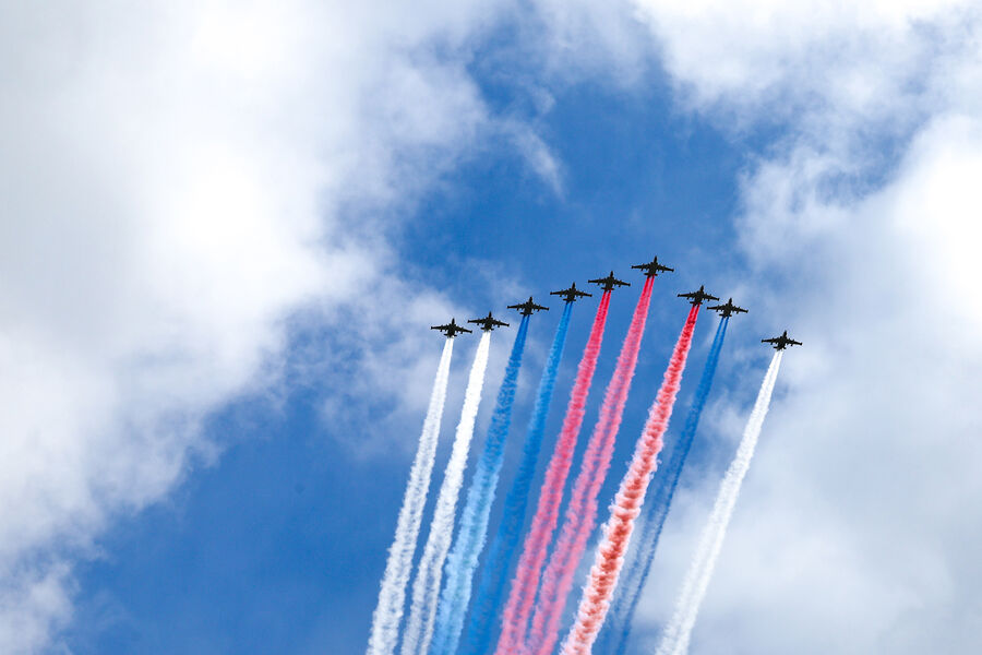 Впервые в истории парад Победы проходит под снегом. Несмотря на погоду, воздушная часть парада все же состоялась. Авиация раскрасила небо над Красной площадью в цвета российского флага.