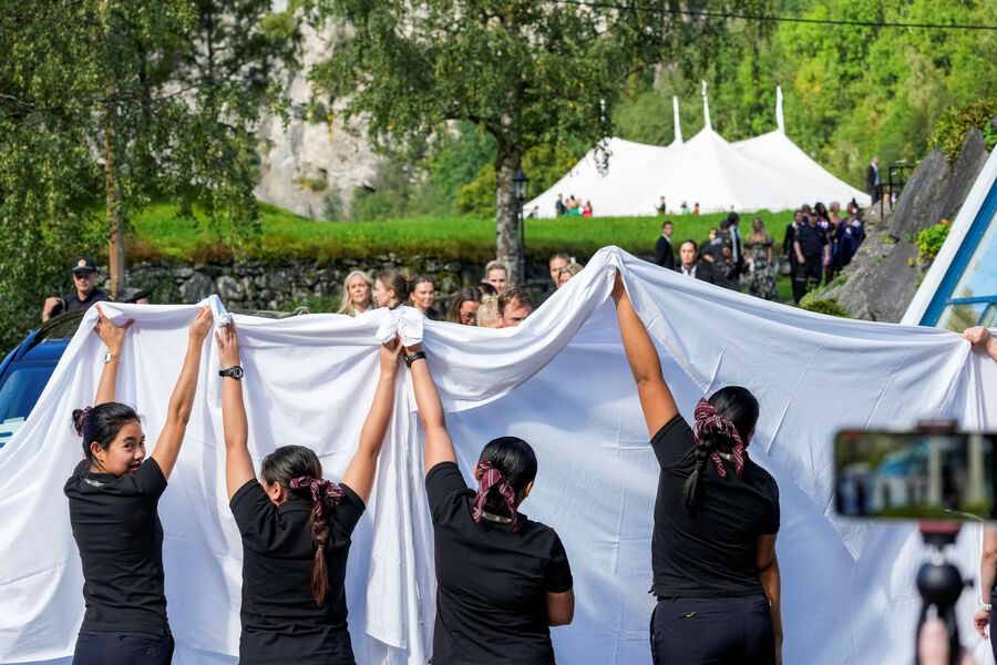 Сама же церемония состоялась 31 августа в белом шатре. На ней присутствовали родители принцессы, ее три дочери от первого брака и брат — наследный принц — со своей семьей. Всего гостями бракосочетания стали около 350 человек.