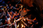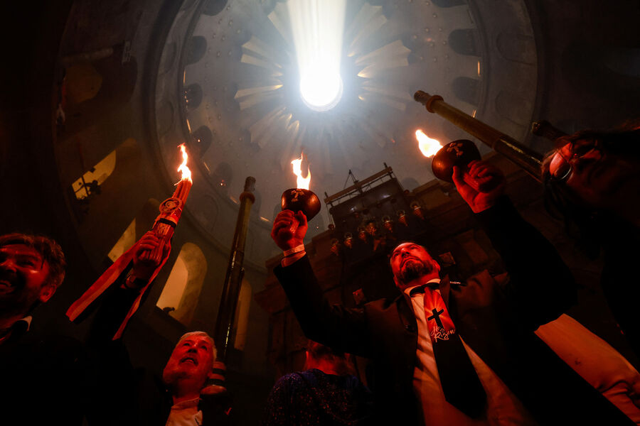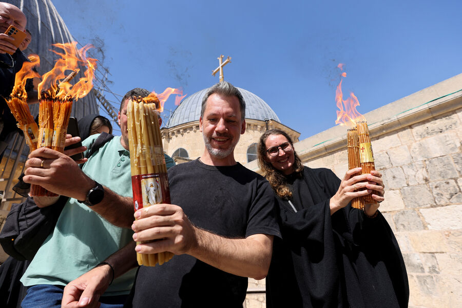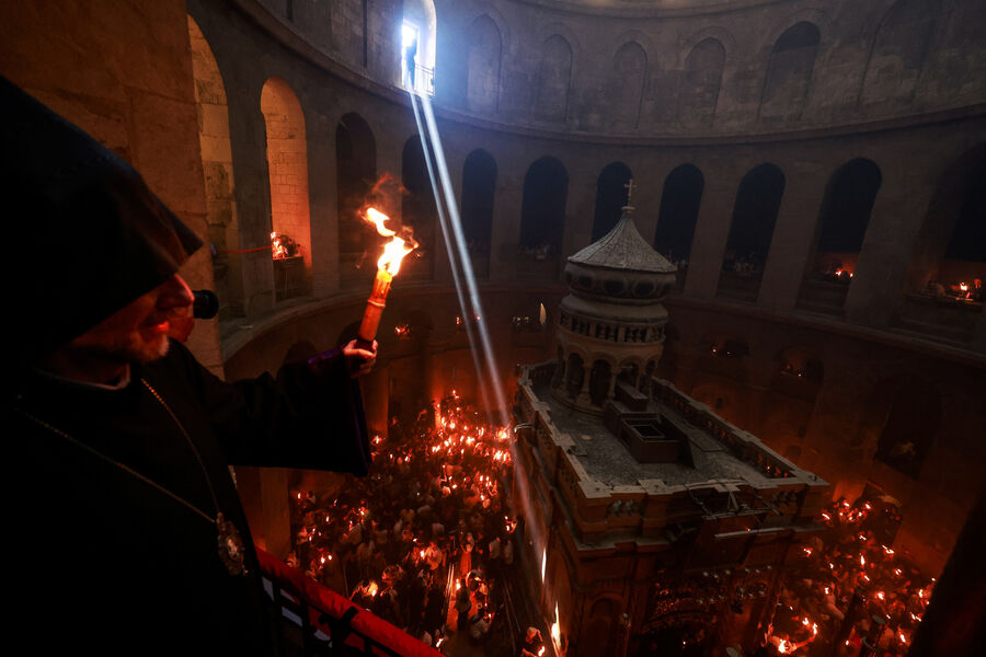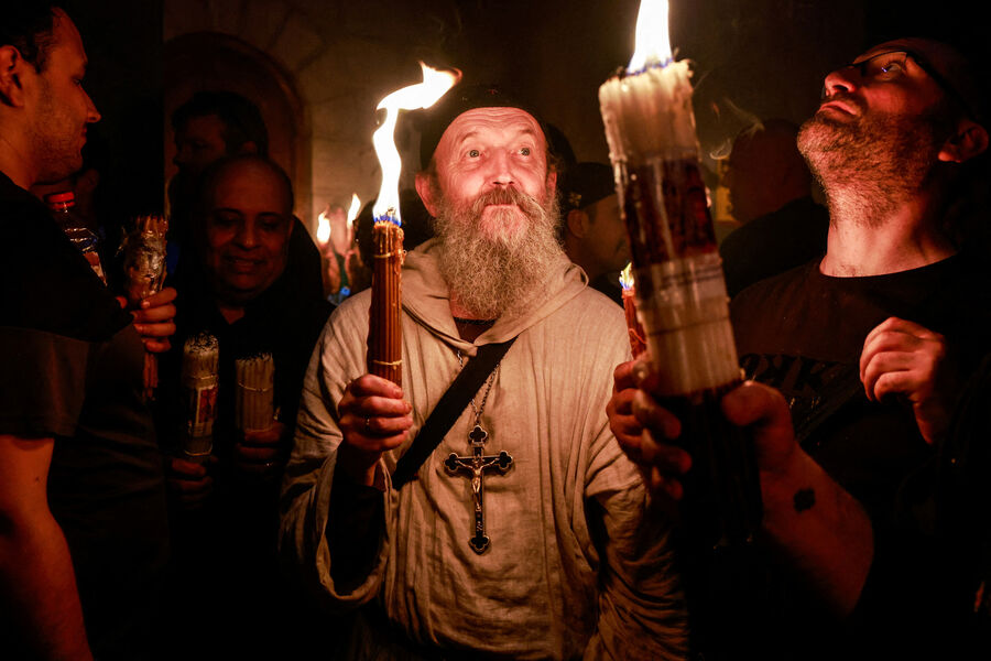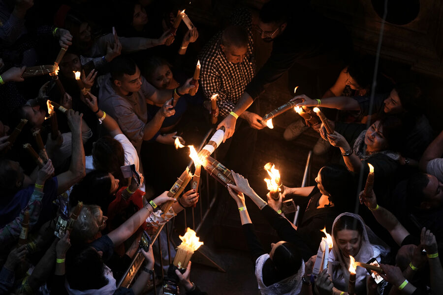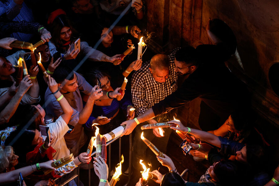 Тысячи верующих собрались у входа в храм Гроба Господня в Иерусалиме, чтобы стать свидетелями ежегодного схождения Благодатного огня. В 2025 году оно произошло 19 апреля, в Великую субботу, за день до Пасхи.