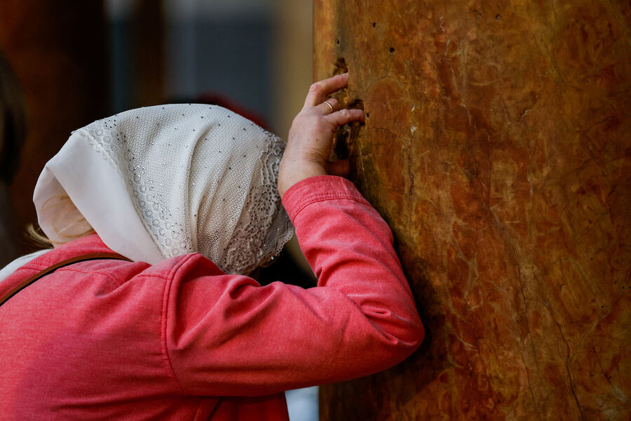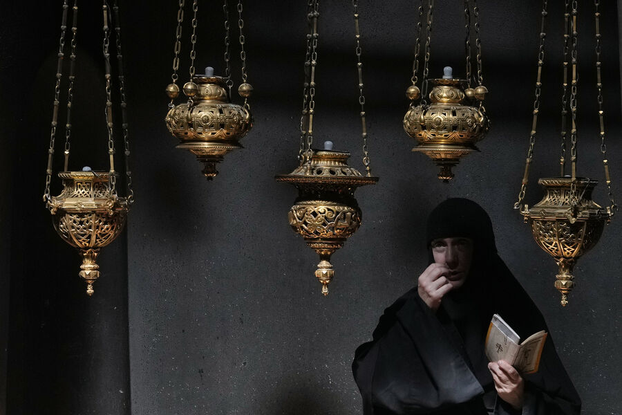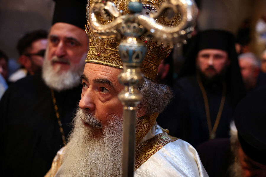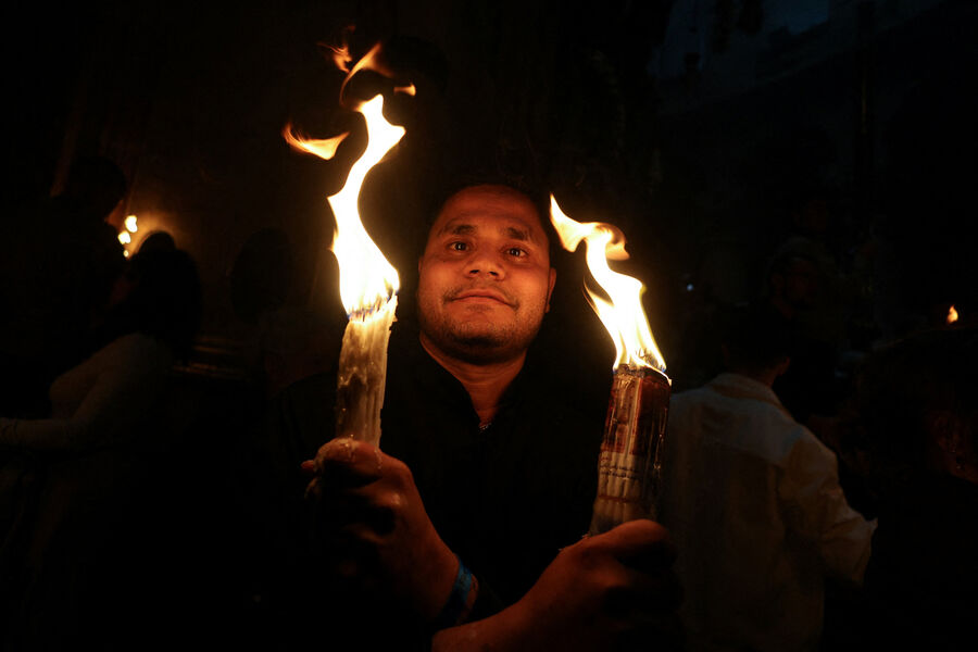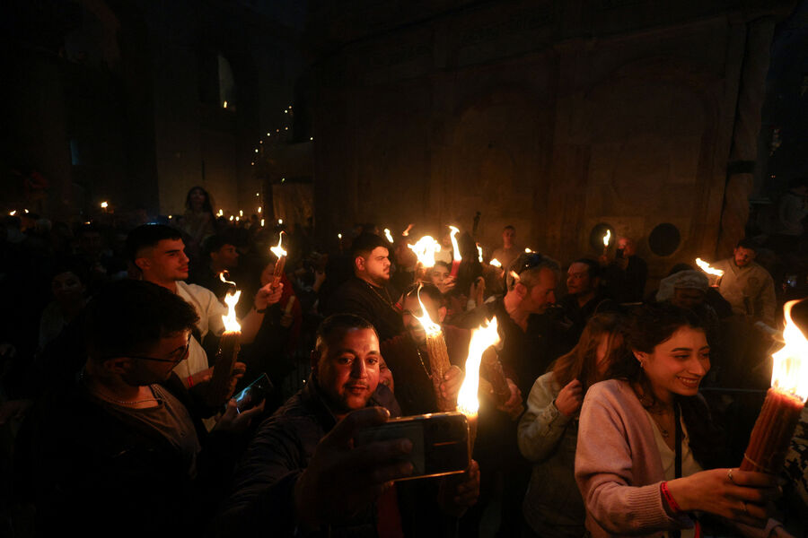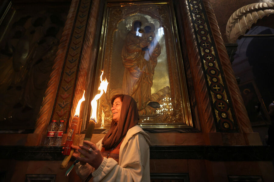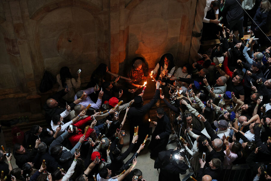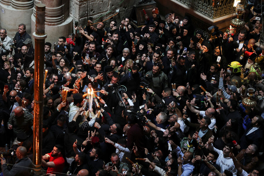 Первым свидетелем огня считается апостол Петр: святитель Григорий Нисский писал, что Петр, узнав о воскресении Христа, прибежал ко гробу и увидел внутри сияние.