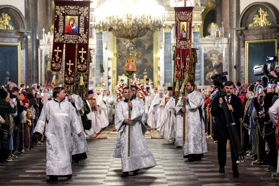 К началу службы в Москву доставили благодатный огонь из Иерусалима. В главном кафедральном соборе страны патриарх Московский и всея Руси Кирилл совершил Пасхальную заутреню и Божественную литургию.