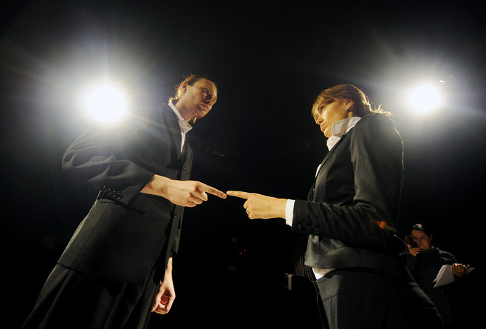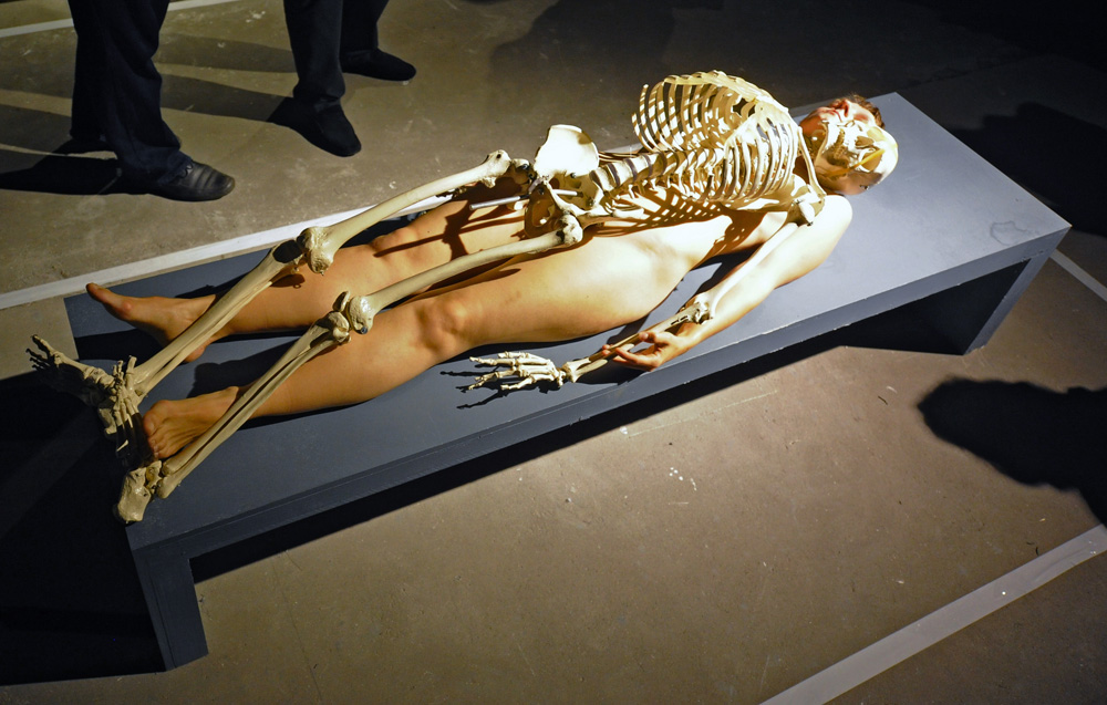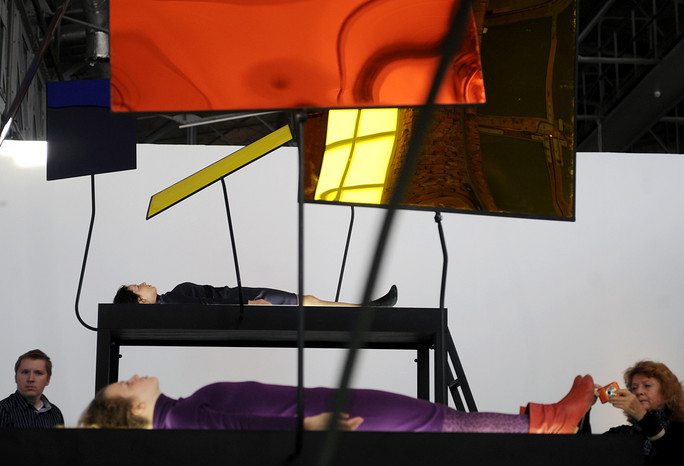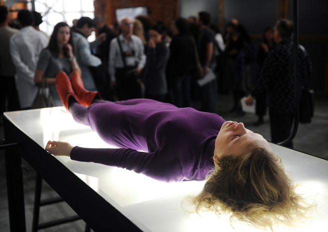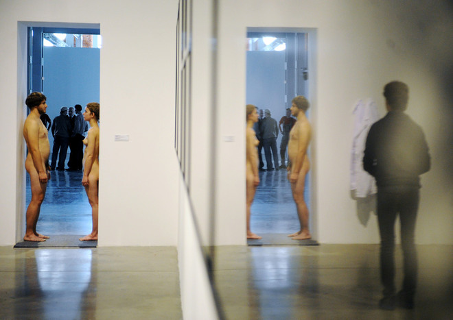 Как правило, волонтеры играют роль «живых изваяний» – например, лежат обнаженными, прикрывшись скелетом, или образуют подобие портала из неприкрытой плоти (посетителям приходится протискиваться между двумя голыми статистами). Эти ремейки не позволяют забыть, что вообще-то перформанс – искусство, существующее «здесь и сейчас». Откликнувшихся на призыв волонтеров (в данном случае аж 47 человек) Марина обучает основам ремесла, после чего юноши и девушки предъявляют публике точные повторы легендарных арт-жестов своей наставницы.