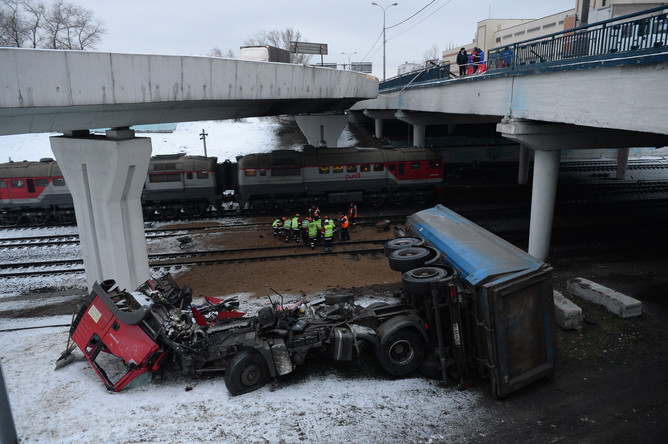 Грузовик упал с моста на железную дорогу в Москве