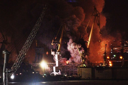 Кадры с места пожара на корвете-невидимке в Петербурге